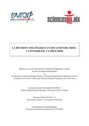 - Introduction ANALYSE DES CONCEPTS DE DÉCISION STRATÉGIQUE ET DE CRISE - La décision stratégique - La crise - Crise et stratégie APPROCHE PRATIQUE DE LA DÉCISION STRATÉGIQUE EN SITUATION DE CRISE - Méthode de recherche - Regard des acteurs sur la décision stratégique en situation de crise LES COMPÉTENCES DE L'OFFICIER SAPEUR-POMPIER EN SITUATION DE CRISE - Regard des acteurs sur les compétences requises en situation de crise - Formulation de préconisations - Conclusion .