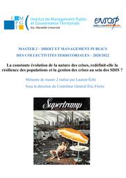 Note de contenu : Résumé de l'auteur : "Le mémoire s’est construit à partir de la problématique suivante: Comment les Services Départementaux d’Incendies et de Secours doivent repenser financièrement et humainement leurs missions partagées au vu de la récurrence des crises multiples ? Après une première partie théorique sur la définition d’une crise, ses multiples facettes ainsi que sa gestion institutionnelle très organisée, une deuxième partie aborde les possibilités et propositions, pour lesquelles les SDIS pourront être des acteurs incontournables dans la compréhension et la résilience des citoyens, mais également pour l’ensemble des acteurs du secours qui constitue les SDIS. Le mémoire apporte un éclairage sur le changement amorcé des mentalités, ainsi que sur l’acculturation du risque auprès de la population que devront envisager nos collectivités pour faciliter les missions des sapeurs-pompiers, eux-mêmes confrontés à un changement de paradigme entre leurs missions exclusives d’aujourd’hui, et leurs missions partagées de demain. La prévention, l’accompagnement financier et l’évolution managériale de nos collaborateurs seront des éléments facilitateurs pour nos Collectivités Territoriales dans cette transition, mais également en envisageant une réorganisation plus cohérente des missions des “soldats du feu”. "