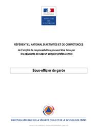 Le présent référentiel décrit les activités et les compétences de l'emploi de sous-officier de garde, emploi de responsabilités pouvant être tenu par les adjudants de sapeur-pompier professionnel.