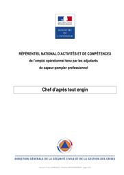 Le présent référentiel décrit les activités et les compétences de l'emploi de chef d'agrès tout-engin, emploi opérationnel tenu par les adjudants de sapeur-pompier professionnel.