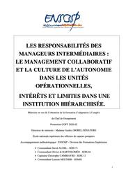 Résumé des auteurs : " Ce mémoire aborde la responsabilité managériale d'un encadrant intermédiaire ayant à pratiquer le management collaboratif et la culture de l'autonomie au sein d'une structure hiérarchisée. Les apports théori...