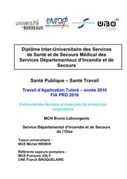 - Remerciements - Résumé - Mots clés - Table des matières - Introduction ENQUÊTE : PRATIQUES ET CONVICTIONS DES SAPEURS-POMPIERS EN MATIÈRE D'INTERACTION ENTRE MASQUES DE PROTECTION ET PARTICULARITÉS FACIALES - Méthode - Résultats - Analyse DISCUSSION - Les missions des sapeurs-pompiers les exposent à des dangers - Les normes et recommandations - Ces précautions sont-elles futiles ? Les données de la science - Ces preuves expérimentales sont-elles reconnues ? L'expérience internationale - Qu'en pense le fabricant de nos EPI ? - En cas d'accident par inhalation, à qui incombe la responsabilité ? - La place du SSSM - Conclusion - Bibliographie - Annexes .