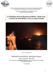 " Le 4 août 2020 à Martigues dans les Bouches-du-Rhône, près de 1000 hectares sont partis en fumée. La particularité de cet incendie est a été sa trajectoire : le feu ne s’est arrêté qu’au bord de l’eau. Cet incendie est un événement majeur pour la Côte Bleue, le territoire situé sur le littoral auquel appartient la commune de Martigues. Une étude de terrain, menée par de nombreuses rencontres avec des habitants et professionnels du risque ce territoire, a permis d’identifier les vulnérabilités de la Côte Bleue. Elle est considérée comme une enclave face au risque incendie : caractérisée par une topographie particulière, un climat très sec et une exposition au vent importante, la Côte Bleue fait face depuis de nombreuses décennies à des feux très intenses et rapides. Ces incendies à répétition posent la question de la résilience du territoire face aux feux, et la question du désenclavement de cette côte souvent prise au piège entre l’eau et le feu. La question de l’enclavement se pose particulièrement dans les calanques. Par sa position littorale, la Côte Bleue fait face à une fréquentation estivale accrue : ce tourisme important pose la question de la culture du risque chez les populations transitoires, ainsi que la question de l’accessibilité en cas d’incendie sur des routes engorgées. Par de gros efforts de prévention et un maillage territorial et interservices majeur, les acteurs de la Côte Bleue sont en capacité de faire face aux vulnérabilités inhérentes à la configuration du territoire, en particulier lors de la saison la plus à risque. "
