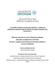 " Face à des défis de plus en plus complexes, les sapeurs-pompiers doivent se préparer à gérer tout type de sinistre et de crise. La préparation à ces situations dimensionnantes revêt des caractéristiques complexes à mettre en œuvre lors des formations. Ce mémoire explore l’intégration de la réalité virtuelle (RV) dans la formation des Commandants des Opérations de Secours (COS) au sein du Service Départemental d'Incendie et de Secours des Alpes-Maritimes (SDIS 06). Depuis six ans, la RV a été progressivement adoptée pour améliorer la préparation des sapeurs-pompiers et depuis 2023 celle des officiers de la chaine de commandement. La capacité de la RV à recréer des environnements immersifs et réalistes permet aux officiers de s'entraîner à prendre des décisions critiques en conditions complexes. Ces simulations visent à renforcer la conscience de la situation (CS) (Situation Awareness, SA) et à affiner la prise de décision dans des contextes où chaque seconde compte.